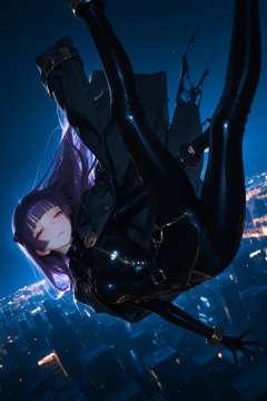 masterpiece,best quality,amazing quality,very aesthetic,absurdres,newest,extreme aesthetic,in the style of fashion photography,light particles,cinematic lighting,Visual impact,sharp focus,Emotionalization,depth of field,dutch angle,scenery,1girl,solo,purple hair,blunt bangs,long hair,purple eyes,black coat on shoulders,torn coat,black bodysuit,gold trim,black gloves,black pants,falling,night,depth of field,cityscape,half-closed eyes,confused,dynamic pose,knee up,looking at viewer,