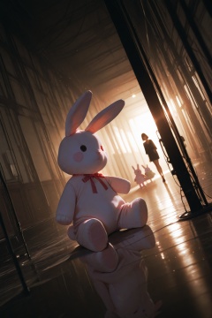 masterpiece,best quality,amazing quality,very aesthetic,absurdres,newest,extreme aesthetic,in the style of fashion photography,light particles,cinematic lighting,Visual impact,sharp focus,Emotionalization,depth of field,dutch angle,scenery,volumetric lighting,surreal,***** woman,stuffed rabbit,