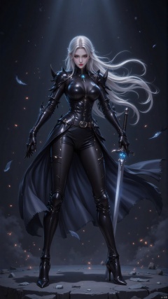 1girl,A picture full of tension,a sword in her hand,dark-bringer,fallen knight,dark arcanist,dark warrior,dark epic,darkness aura,dark phantasy,artorias,holy sword in her hands,evil knight,infernal art in good quality,darkpowerful elegant,vergil,darkness background,berserk guts,dark backround,deathknight,shadow armor,omen from valorant,elf knight,shadowverse style,sharp black armor,dark knight,black shiny armor,dark armor,celshaded art,undead knight,dark backgroud,darkness's background,epic exquisite character art,beautiful sword,epically luminous image,concept art,