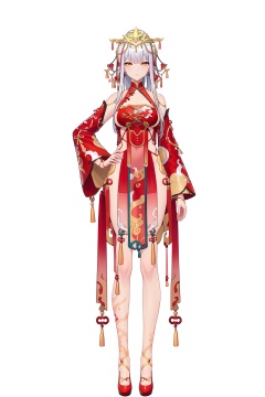 score_9,score_8_up,score_7_up,score_anime,8k,best quality,masterpiece,(ultra-detailed),(high detailed skin),(by nanoless, by misumi \(macaroni\),:0.5),<lora:YLI 0.1v:0.25>,<lora:style1:0.25>,A full-body portrait of a young girl,standing gracefully,pastel art style,high-key lighting,shoujo manga influence,hd quality,delicate details,full body,full shot,standing,looking at viewer,(solo:1.2),simple background,white background,hand on own hip,<lora:cbcnwed-pony-Tanger-000019:0.8>,Ji Chenxing,clothes: Ji Chenxing red weding dress,1st clothes,Ji Chenxing golden tiara,silver hair,1girl,red footwear,breasts,long hair,golden leg tattoo,