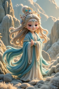 精卫是一只小巧的毛毡鸟,羽毛色彩鲜艳,嘴里叼着一颗小石子,飞向波涛汹涌的大海。海浪用蓝色毛毡卷曲而成,表现出大海的凶猛和精卫的执着。