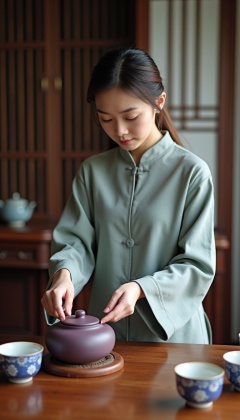 In the tea room at home,the solid wood tea table is equipped with delicate purple sand teapots and blue-and-white porcelain teacups. The Chinese beauty is wearing a simple Chinese-style modified jacket with wide-legged trousers and her hair is casually tied into a low ponytail. She is cooking tea intently and making tea. Her movements are skillful and elegant. Her face is facing the camera. The fragrance of tea is curling up,which contrasts with her attentive and shows a quiet and far in traditional Chinese culture,