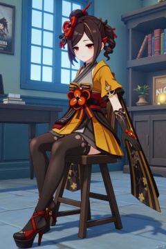 A Genshin Impact female character with waist-length hair, red eyes, and red hair accessories. She wears a traditional and modern fusion outfit, including black tights, a red and gold sash, high-heeled platform shoes, and a yellow and white top. She is sitting on a wooden chair in an indoor office-like setting with blue walls and bookshelves in the background. The scene features cinematic lighting, high contrast, and sharp focus, with a dynamic composition. A detailed background includes a movie poster with three-dimensional text AGlong in the middle below, enhancing the dramatic atmosphere.