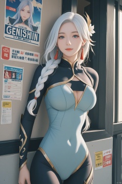 1girl, solo, upper body, very long white braided hair with a braided ponytail, hair over one eye, bangs, blue eyes, looking at viewer, blush, smile, parted lips, hair ornament, tassel earrings, tassel, bodysuit with gold trim, clothing cutout, flower, Shenhe (Genshin Impact) style, movie poster, three-dimensional text AGlong in the middle below, cinematic lighting, dynamic composition, detailed background with poster theme, high contrast, sharp focus, dramatic atmosphere.