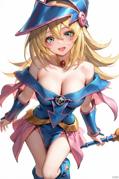masterpiece, best quality, high quality, Dark Magician Girl \(ygo\), 1girl, solo, long hair, looking at viewer, blush, smile, open mouth, blonde hair, hair between eyes, green eyes, standing, full body, empty hands, pentacle, white background, simple background,