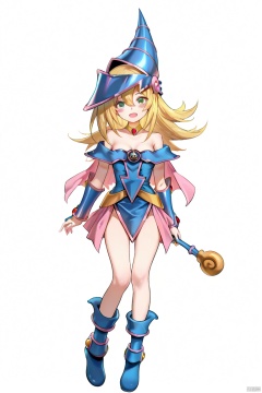 masterpiece, best quality, high quality, Dark Magician Girl \(ygo\), 1girl, solo, long hair, looking at viewer, blush, smile, open mouth, blonde hair, hair between eyes, green eyes, full body, empty hands, pentacle, white background, simple background, loli,