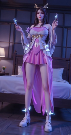 Cyberpunk,Cyberpunk electronic luminous clothing,full body multi luminous line light strips,full body multi luminous text,1girl,solo,Cyberpunk luminous line and luminous text pink hip hugging dress,luminous text on the chest“tusi”,holding luminous mechanical rectangular objects in both hands,long sleeves,standing in front of the bed,upper body,above knees,slightly sideways,looking at the camera,indoor,bed,desk lamp,pillow,diamond grid shaped background wall,
