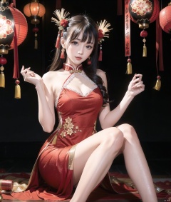 Beauty wearing a red dress. Pass the Chinese New Year. The background is a festive background, and there are beautiful blooming fireworks in the sky.