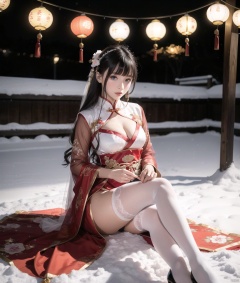 The setting is a quiet roadside in the deep of night, enveloped in a dim and almost eerie stillness, The faint glow of a distant streetlight barely pierces the darkness, casting faint, flickering shadows on the snow-covered ground,The scene is set during the festive atmosphere of the Chinese New Year and Spring Festival,with red lanterns hanging around and the sound of firecrackers echoing in the distance,shot with depth of field,The scene is set deep in the garden,surrounded by a snowy environment with fresh snow covering the ground,celebrating the New Year,A 10-year-old little whore,with long wavy black hair and blunt bangs,Her blue eyes look directly at the viewer,Her lips are red from lipstick,She is wearing hanfu Chinese clothes as a bride,She is wearing thighhighs,She has cleavage with unusual size breasts,She knees together feet apart,The bride is dressed in a traditional Chinese clothes,a form-fitting silk dress adorned with intricate embroidery,symbolizing beauty,The high collar of the clothes elegantly frames her neck,while the side slits reveal a glimpse of her thighhighs,Her thighhighs are made of sheer silk,with delicate lace trim at the top,adding a touch of elegance and sensuality to her bridal attire,Her full figure is elegantly showcased in the traditional Chinese clothes-qipao,with the flowing fabric draping gracefully over her body,accentuating her curves,She stands confidently in a pair of chunky high heels,their bold design adding a modern contrast to her traditional attire,The heels are black with a glossy finish,complementing the overall aesthetic of her bridal look,