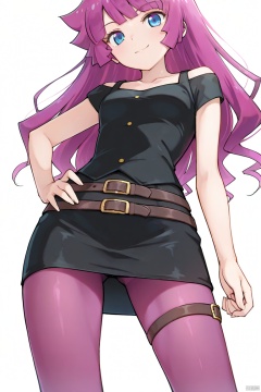 masterpiece, best quality, high quality, Kirishima Romin \(ygo\), 1girl, solo, long hair, looking at viewer, smile, blue eyes, skirt, simple background, white background, purple hair, pantyhose, belt, hand on hip, thigh strap,