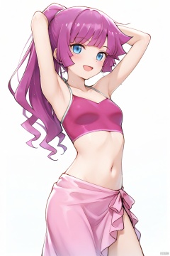 masterpiece, best quality, high quality, Kirishima Romin \(ygo\), 1girl, solo, long hair, breasts, looking at viewer, blush, smile, open mouth, bangs, blue eyes, simple background, navel, standing, swimsuit, ponytail, purple hair, cowboy shot, small breasts, midriff, armpits, arms up, sarong,