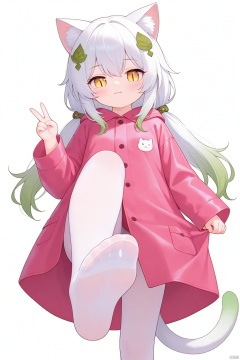 tsubasachyan,lolisugerjio,cxnice3,masterpiece,best quality,high quality, loli,solo,petite,cat girl,cat ears,cat tail,small breast,white hair,green hair, bangs, hair ornament,leaf hair ornament,gradient hair, gradient tail,low twintails,yellow eyes,slit pupils,(nahida \(genshin impact\):0.3),standing,simple background,white background,V,rain coat,cxgoodfeet,foot view,presenting foot,