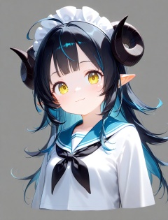 1girl, solo, horns, white background, sailor collar, simple background, long hair, yellow eyes, pointy ears, maid headdress, black neckerchief, looking at viewer, ahoge, neckerchief, blue sailor collar, blue hair, upper body, closed mouth, curled horns, cropped torso, smile, :3, serafuku, black hair, school uniform, white shirt, portrait, shirt