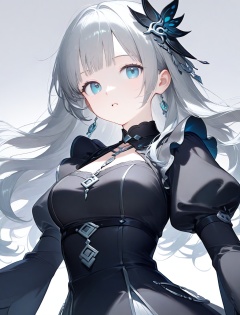 1girl, bangs, black_dress, blue_eyes, breasts, dress, grey_hair, hair_ornament, juliet_sleeves, long_hair, long_sleeves, looking_at_viewer, medium_breasts, parted_lips, puffy_short_sleeves, puffy_sleeves, simple_background, solo, upper_body, white_background