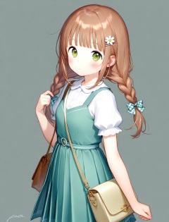 1girl, solo, braid, hair ornament, twin braids, blush, long hair, white shirt, hairclip, plaid bow, shirt, bow, dress, flower, bag, pinafore dress, short sleeves, simple background, brown hair, hair bow, white flower, looking at viewer, sleeveless dress, signature, green dress, shoulder bag, brown eyes, pleated dress, hair flower, sidelocks, sleeveless, plaid, grey background, white background, green eyes, puffy sleeves, blunt bangs