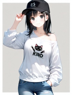 1girl, solo, black hair, hat, denim, pants, grey background, baseball cap, white border, jeans, shirt, looking at viewer, smile, border, black eyes, hand in pocket, white shirt, long sleeves, single bare shoulder, :3, hand on headwear, closed mouth, simple background, outside border, clothes writing, medium hair, adjusting headwear, off shoulder, cat print, animal print, breasts, black headwear, blue pants, adjusting clothes, collarbone, print shirt, medium breasts, standing, long hair, contrapposto, single off shoulder