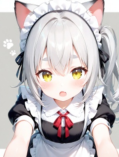 1girl, solo, long hair, looking at viewer, blush, open mouth, bangs, simple background, shirt, dress, ribbon, animal ears, hair between eyes, yellow eyes, white shirt, short sleeves, grey hair, frills, fang, puffy sleeves, grey background, apron, black dress, side ponytail, red ribbon, puffy short sleeves, maid, maid headdress, neck ribbon, thick eyebrows, waist apron, white apron, two-tone background, skin fang, maid apron, frilled apron