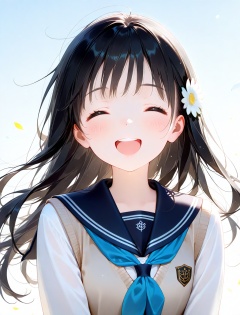 1girl, solo, closed eyes, smile, open mouth, blush, hair ornament, sailor collar, hair flower, blue neckerchief, upper body, school uniform, shirt, flower, black hair, teeth, long hair, facing viewer, neckerchief, white flower, white shirt, :d, sweater vest, upper teeth only, happy, serafuku, blue sailor collar, floating hair, ^_^, black sailor collar, vest, wind