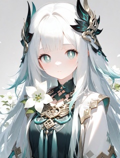 (masterpiece),(best quality),1girl, bangs, bright_pupils, closed_mouth, flower, grey_background, hair_ornament, long_hair, looking_at_viewer, solo, upper_body, very_long_hair, white_flower, white_pupils