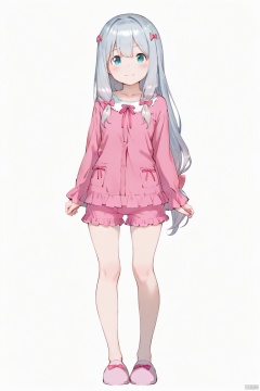 masterpiece, best quality, high quality, Izumi Sagiri \(Eromanga Sensei\), 1girl, solo, long hair, looking at viewer, blush, smile, bangs, blue eyes, simple background, shirt, long sleeves, white background, bow, ribbon, very long hair, closed mouth, standing, collarbone, full body, hair bow, grey hair, frills, shorts, pink bow, low-tied long hair, pink shirt, pajamas, slippers, pink shorts, frilled shorts,