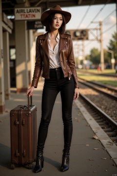 A woman stands on the platform of an abandoned train station, wearing a vintage-style brown leather jacket paired with a white shirt and black high-waisted pants, completed with ankle boots, creating a sharp and timeless look. Her pose is full of narrative, with one hand resting on an old suitcase and the other lightly touching the brim of her hat, her gaze fixed into the distance as if waiting for someone or something. The background features rusty train tracks and a weathered station sign, with the glow of the setting sun casting a cinematic atmosphere of farewell and anticipation.