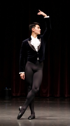 On the stage of the ancient European-style theater.The male ballet dancer makes his entrance in a black velvet tailcoat-style performance costume. The slim-fit design accentuates his broad shoulders and firm waist. The white lace at the collar is delicate and fine, adding a touch of tenderness to the masculinity. He stands sideways, with one leg slightly bent and the toes lightly touching the ground. One hand hangs naturally, while the other is gracefully bent and raised above the head, with the fingers gently twisting, as if whispering to an invisible partner. His figure shows nobility in the interlacing of light and shadow.