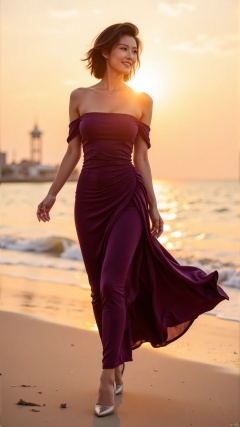 The setting sun casts its glow all over the beach by the sea. A tall naturalistic female is strolling on it. She is in a flowing off-the-shoulder long dress in dark purple, and the skirt dances gently in the wind. She is wearing stiletto heels and walking with a light and confident step. The sea breeze stirs her curly hair, and she is smiling with a free and easy look in her eyes. In the distance is the sparkling sea and the orange-red skyline. The beach, the waves and the sunset glow interweave into a dreamy background, perfectly interpreting the artistic beauty of a sexy and domineering lady, just like a beautiful scene in a movie.
