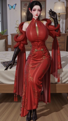 best quality,realistic,Hugebr,huge breasts,huge buttocks,1girl,solo,black hair,hair ornament,tassel,gloves,black gloves,long sleeves,detached sleeves,red dress,chinese clothes,china dress,jewelry,black high heels,butterfly,sitting on the bed,bed,indoors,modern home background,Hugebr,YMJHyubichaoyang,luxueqi,QipaoQ