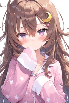 1girl,solo,long hair,looking at viewer,blush,smile,bangs,brown hair,shirt,hair ornament,long sleeves,white background,hair between eyes,very long hair,closed mouth,purple eyes,upper body,ahoge,virtual youtuber,star \(symbol\),sleeves past wrists,crescent,messy hair,sleeves past fingers,pink shirt,pajamas,star print,