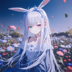 masterpiece,best quality,high quality,loli,loli,loli,1girl,solo,long hair,tender sister,upper body,blush,unusual pupils,clothed,Flowers,cornflowers,late at night,ruins,blue flowe,flower sea,//,Lanlan,1girl,ahoge,silver hair,pale_skin,gradient eyes,aqua eyes,fair_skin,very long hair,alice_\(alice_in_wonderland\),necklace,petite,long hair,white hair,bangs,blue eyes,medium breasts,hair ornament,ribbon,hair between eyes,fake animal ears,hair ribbon,hairband,hairclip,star \(symbol\),neck ribbon,blue ribbon,star hair ornament,blue hairband,rabbit ears,blue ears,wardrobe_error,strap_slip,//,(Artist chen bin:1.5),(Artist agwing86:1.3),(Artist aki99:0.5),(Artist z282g:0.9),artist:wanke,(artist:ke-ta:0.6),[Artist:wlop],(Artist wsman:0.6),(fkey:0.5),(hiten \(hitenkei\):0.6),omone_hokoma_agm,[[Artist amashiro natsuki]],//,official art,depth of field,high contrast,colorful,detailed light,light leaks,beautiful detailed glow,best shadow,shiny skin,cinematic lighting,ray tracing,best quality,amazing quality,very aesthetic,absurdres,beast quality,masterpiece,ultra detailed,newest,8K,HDR,