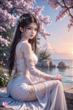 Oshino Shinobu from Gown,cute girl,wearing white gothic-style gown.strong sense of light,high contrast light,shining details,wide scene,digital painting,dreamy mood,ethereal,fantasy art style,fantasy concept art,high contrast,ultra-detailed,charming anime-inspired,with slight lighting,and tree surrounded blossom by,sitting under the flowers,the Dundar light from above,digital art,illustration,charming,ethereal,mysterious,fantasy,ethereal,elegant,airy,magical,surreal,dreamy,strong sense of light,outdoors,beside the coast,sea in background,floating dress in the gentle breeze,from side,her head turn back towards viewer