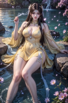 mash kyrielight,fate \(series\),1girl,full_body,curled up,lying in the water,with black smoke,looking,tears,yellow_dress,