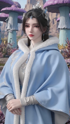 She wears a light blue, high-collared cloak with a luxurious, white fur trim, exuding a sense of elegance and nobility. Underneath, her attire is a subtle grey garment with intricate, silver embroidery. A silver chain and pendant hang from her neck, complementing her refined appearance. The background is a fantastical, alien landscape, characterized by towering, purple and blue mushroom-like structures with intricate, spiky textures. The scene is bathed in a soft, natural light that enhances the ethereal quality of the environment.