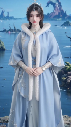 limuwan, , which is a highly detailed CGI rendering of a woman in traditional Chinese attire. The woman stands in the center, facing the camera. She has fair skin and dark brown, slightly wavy hair styled in a loose, flowing manner, adorned with a delicate silver tiara. Her facial features are delicate, with a subtle makeup accentuating her eyes and lips. She wears a long, flowing robe in a light blue hue, with intricate white and silver embroidery and a fur-trimmed collar. The robe has a fitted bodice and a flowing skirt, creating a graceful silhouette. Her sleeves are long and fitted, with a similar fur-trimmed cuff. The fabric appears to be made of a smooth, shiny material, possibly silk or a similar fabric, reflecting light and giving it a luxurious appearance. The background is a softly blurred, blue-hued landscape, with a hint of abstract, stylized elements, such as a blue wave or a stylized mountain, suggesting a serene, ethereal setting. The overall mood is one of elegance and tranquility, with a strong emphasis on traditional Chinese aesthetics.