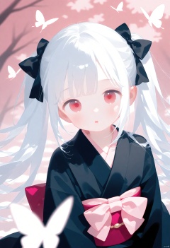 1girl, solo, long hair, looking at viewer, blush, bangs, red eyes, long sleeves, bow, twintails, very long hair, upper body, white hair, hair bow, parted lips, japanese clothes, kimono, blurry, :o, black dress, black bow, floating hair, depth of field, animal, bug, pink bow, butterfly, black kimono