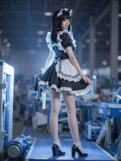 This is a high-resolution photograph of a young woman dressed in a cosplay costume. She stands in a playful, provocative pose, with her back turned to the camera, revealing her slender physique. Her costume is a traditional French maid outfit, featuring a black and white maid dress with short sleeves and a frilled apron, complete with a white headband and black cat ears. She holds a toy gun in her right hand, pointed towards the viewer. Her black hair is styled in a bob with bangs, and her makeup is minimal, with a hint of pink lipstick and light eyeshadow.The background is a cluttered industrial setting, with blue and white metal structures and a bright, glowing light source illuminating her from behind, creating a dramatic effect. She stands on a blue platform, possibly a stage, with a blurred, dark background suggesting a studio setting. Her costume is detailed and tailored, with a slightly revealing neckline and a high slit in the skirt, emphasizing her slender legs. The overall aesthetic combines elements of cosplay and fetish, with a touch of anime influence, particularly in the maid outfit and cat ears. The image is vibrant and well-lit, highlighting the intricate details of her costume and the playfulness of her pose.<lora:YY-超女-女仆装F.1:1>,