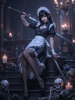This is a highly detailed digital illustration featuring a young woman in a classic French maid outfit,set in a dark,gothic-themed room. The subject is a slender,East Asian woman with fair skin and long,straight black hair styled in a bob with bangs. She wears a black and white maid uniform with a white apron,puffed sleeves,and a white lace headpiece. Her expression is serious and her lips are painted red,adding a touch of seductiveness to her appearance. She holds a katana sword with a black handle and a blade with intricate designs,poised in a defensive stance.,The background is dimly lit,with a staircase and a gothic-style chandelier casting a warm glow. The room is adorned with candles and a skull,adding a macabre element. In the foreground,there are two additional skulls,one with a crown,and a skeleton with a sword. The overall atmosphere is dark and mysterious,evoking a sense of Gothic romance or horror. The textures of the maid uniform and the sword are meticulously detailed,while the background elements are rendered with a soft,moody lighting,enhancing the eerie,yet captivating,atmosphere.,<lora:YY-超女-女仆装F.1:1>,