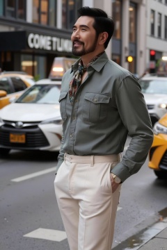csns,fex,mature men, He is smiling and looking to the side, with a relaxed expression. With his hands in his pockets, his stance is casual, showing a relaxed state. He is dressed in a gray - green shirt and beige trousers, with a patterned silk scarf around his neck, full of fashion sense. The background is a city street with traffic flowing, creating a bustling urban atmosphere.