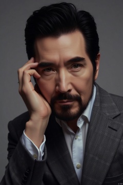 csns,fex,mature men, He has a profound demeanor, with sharp and focused eyes and a calm expression. He supports his cheek with one hand, in an elegant and contemplative posture. Dressed in a high - quality gray suit and a white shirt, he shows his gentlemanly demeanor. The single - tone background highlights the main subject, creating a steady and introverted atmosphere.