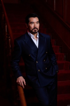 csns,fex,mature men, He has a calm expression and deep eyes, leaning against the staircase railing with an elegant posture. He is wearing a dark blue suit with a white shirt underneath, simple yet stylish. The dark red staircase background and soft lighting create a calm and noble atmosphere.
