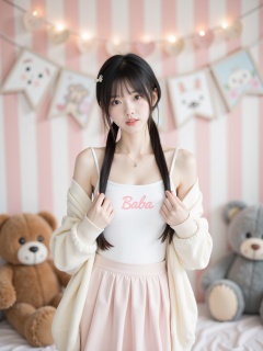 photo of a young Asian woman in a cute, cozy room, taken with a DSLR camera, likely a Canon EOS 5D Mark IV, f/2.8, 1/60s, ISO 400, shallow depth of field with background slightly blurred. She has long, straight black hair styled in two low pigtails, and a small white bow on the left side. She has a fair skin tone, delicate features, and a slender build. She's wearing a white, fitted **** top with \"Baba\" written in pink cursive letters, and a loose cream-colored cardigan. Her skirt is a soft pastel pink, high-waisted, and slightly flared. She accessorizes with a delicate necklace and a pair of stud earrings. Behind her, there's a pink and white striped wall, a banner with \"Baba\" and animal illustrations, and a couple of large stuffed animals on the sides, one is a brown teddy bear, the other a grey teddy bear. The room has a warm, inviting atmosphere with soft lighting. The image has a soft, dreamy quality, suitable for a kawaii (cute) aesthetic. The woman has a neutral expression and is posing with her hands near her shoulders. The overall scene is cheerful and endearing, with a focus on cuteness and comfort.<lora:小红书顶流嫩妹脸模FLUX:1>