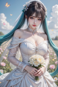 Masterpiece, best quality, high quality, (colorful), medium chest, (black hair: 1.4), (long legs: 1.3),illustration, digital art, official art, 8k wallpaper, Kiri, ultra detailed, beautiful, masterpiece, best quality, pink fantasy theme rainbow style gothic solo, daytime, beautiful girl with a white veil on her head, wedding dress, she is wearing a cosplay costume of the popular virtual singer Hatsune Miku, she has long, bright turquoise twin ponytails, green twin ponytails, green eyes, looking down, daytime, holding a white bouquet of flowers in front of her chest, bright, mysterious, haunting, dramatic, gorgeous, detailed. vibrant, beautiful, flower field, detailed. modern, highly detailed