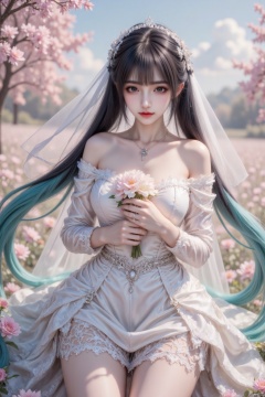 Masterpiece, best quality, high quality, (colorful), medium chest, (black hair: 1.4), (long legs: 1.3),illustration, digital art, official art, 8k wallpaper, Kiri, ultra detailed, beautiful, masterpiece, best quality, pink fantasy theme rainbow style gothic solo, daytime, beautiful girl with a white veil on her head, wedding dress, she is wearing a cosplay costume of the popular virtual singer Hatsune Miku, she has long, bright turquoise twin ponytails, green twin ponytails, green eyes, looking down, daytime, holding a white bouquet of flowers in front of her chest, bright, mysterious, haunting, dramatic, gorgeous, detailed. vibrant, beautiful, flower field, detailed. modern, highly detailed