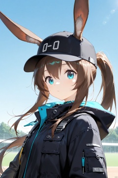 1girl, solo, long hair, looking at viewer, bangs, blue eyes, brown hair, hat, animal ears, hair between eyes, closed mouth, jacket, upper body, outdoors, sky, day, hood, rabbit ears, official alternate costume, blue sky, black jacket, black headwear, baseball cap, ears through headwear, amiya \(arknights\)