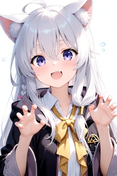 1girl, elaina (majo no tabitabi), animal ears, ahoge, shirt, solo, long hair, cat ears, white shirt, fang, white background, open mouth, robe, purple eyes, bow, black robe, long sleeves, simple background, wide sleeves, blush, yellow bow, looking at viewer, collared shirt, claw pose, hair between eyes, kemonomimi mode, open robe, upper body, open clothes, yellow bowtie, flying sweatdrops, hooded robe, animal ear fluff, hands up, grey hair, bowtie, yellow ribbon, hood, white hair, smile, ribbon, hood down, cat girl