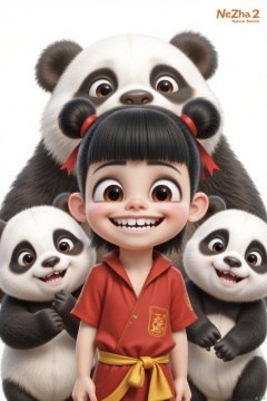 A medium-sized cartoon character wears a red ribbon around their waist. This character has black hair, tied in two buns, and a bow tied to the top of their head. Their eyes were wide open, their mouths slightly parted, revealing sharp teeth. Behind them are two adorable giant pandas, with a light gradient background that contrasts sharply with the characters' clothing. The words' NeZha 2 'are prominently displayed in the upper right corner of the image.