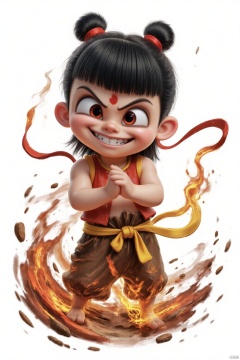 nezha666,This photo is overall in clay style,with many fingerprint textures and clay details on the clay surface. The surface is smooth with subtle shadows,depicting a young boy with black hair,red eyes,and a mischievous smile. She was wearing a sleeveless red top,brown pants with a yellow belt,and had a red spot on her forehead. The background is pure white. There's fire under my feet,clay style,