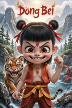 A medium-sized cartoon character wears a red ribbon around their waist. This character has black hair, tied in two buns, and a bow tied to the top of their head. Their eyes were wide open, their mouths were wide open, revealing sharp teeth. An evil smile, a red flame tattoo on the forehead, and a Northeast tiger beside them, the background of mountains, rivers, and pine trees contrasts sharply with the character's clothing. The words' Dong Bei 'are highlighted in the upper right corner of the image.