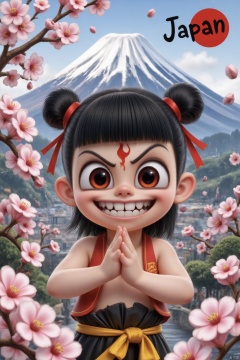 A medium-sized cartoon character wears a red ribbon around their waist. This character has black hair, tied in two buns, and a bow tied to the top of their head. Their eyes were wide open, their mouths were wide open, revealing sharp teeth. An evil smile, a red flame tattoo on the forehead, and cherry blossoms blooming beside them create a sharp contrast between the background of Mount Fuji in Japan and the character's clothing. The word 'Japan' is prominently displayed in the upper right corner of the image.