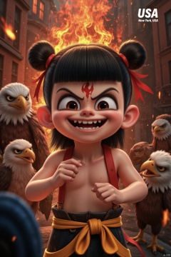 A medium-sized cartoon character wears a red ribbon around their waist. This character has black hair tied in two buns and a bow tied around their head. They opened their eyes wide, their mouths wide open, revealing their sharp teeth. The evil smile, the red flame tattoo on the forehead, and the bald eagle next to it create a sharp contrast between the background and the character's attire in New York, USA. The word 'USA' is highlighted in the upper right corner of the image.